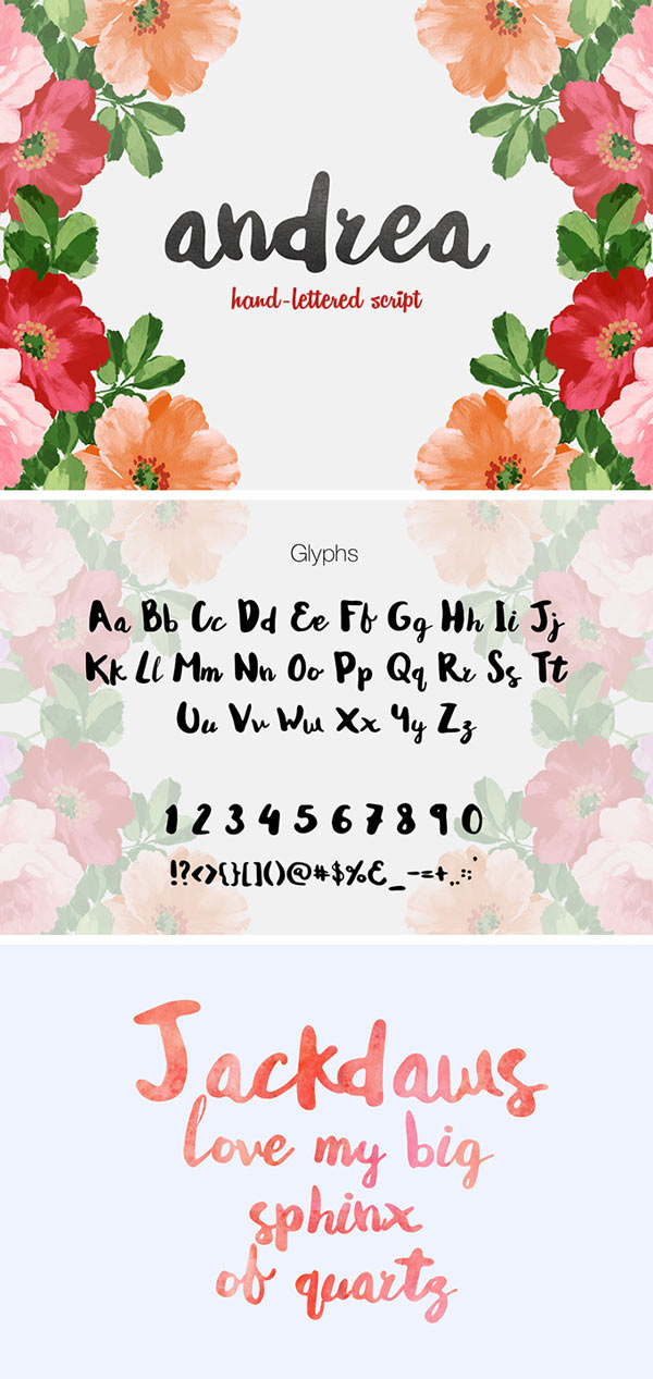 Andrea Script is a beautiful hand-drawn font carefully crafted with love and expertise! Hand lettering fonts are so popular right now and with Andrea font, you can create stunning fashion, apparel, stationery, magazines, films, and marketing with ease!